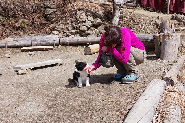 登山道は、杉林の中単調ななだらかな道が堂所まで続く。景色もなくつらい登りだ。七ッ石小屋に着くと正面には富士山が見え自然と顔がほころぶ。ここでお茶タイム。飼い猫が迎えてくれる。どうやら看板猫のようだ。
