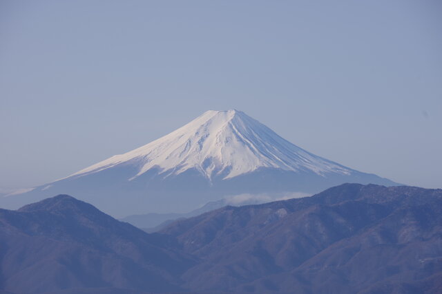 小屋からは急登を30分登ると七ッ石山に着く。立派な石の道標が立つ。一度下り小雲取山に向かう。左側には常に富士山と南アルプスが見える。小雲取山には小さな木の表札が木に括り付けられている。
