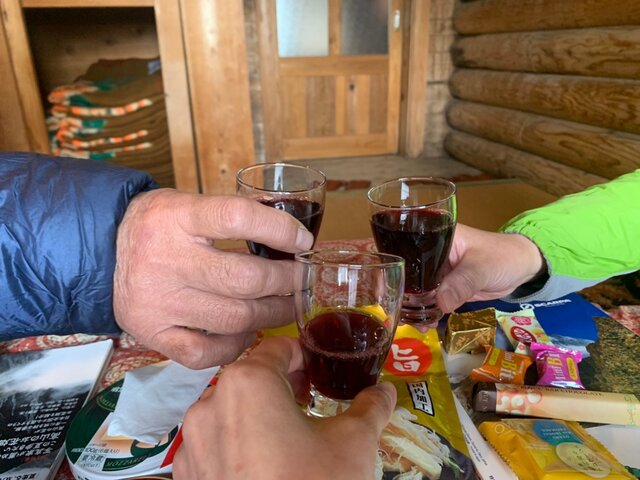 ワインで登頂祝いの乾杯。楽しいひと時を過ごすことができた。
