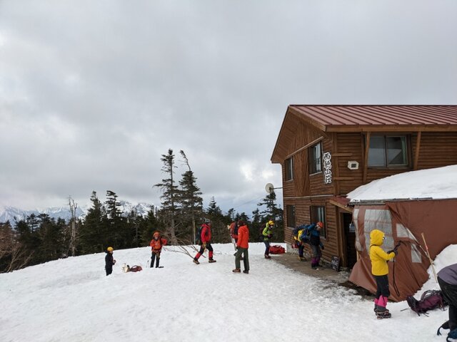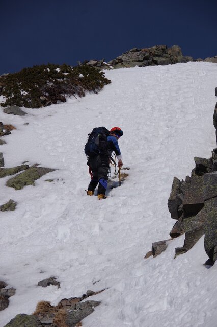 当初は2日目に登頂予定であったが天気が荒れるとの予報だった為このまま頂上を目指す。ピッケルと念の為ハーネスを装備。稜線へ出てからもほぼ無風状態で、Tシャツで登っている登山者もみられた。雪は締まっていて歩きやすい。