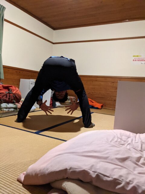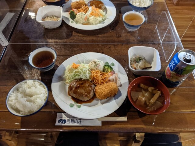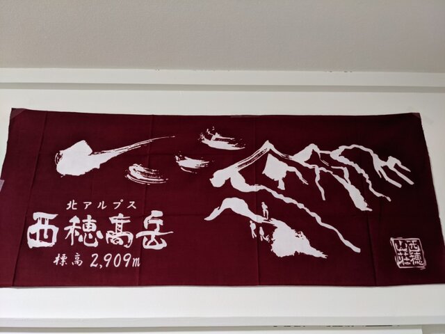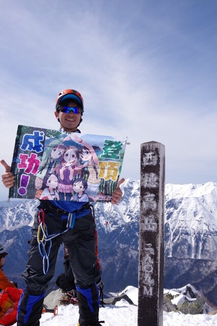 奥穂から前穂に延びる吊尾根、槍の先には遠く剱岳まで見渡せる。積年の思いが込み上げてきた。会長や後から登ってきた他の登山者とも喜びを分かち合う。更には先日発表された『ヤマノススメ Next Summit』の製作決定を祝し記念撮影。「また来るぜ」と捨て台詞を言い残し下山。この日は西穂山荘に宿泊。売店でお土産の手ぬぐいを購入した。晩飯はハンバーグ。一口食べてみる。うまい、うますぎる!