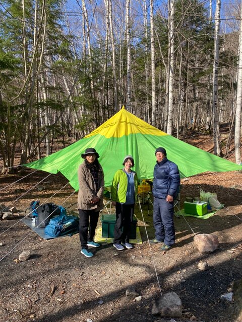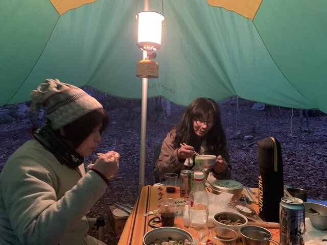 河川敷に近い林の中にテントを張り、初日の夜はキムチ鍋、2日目はポトフ―と美味しい鍋で夕食の団欒、ホットワインで体も温まり、笑顔にあふれたテント場でした。