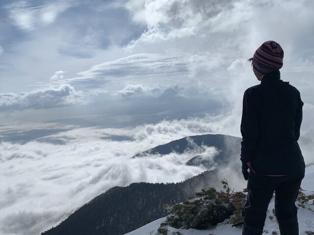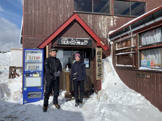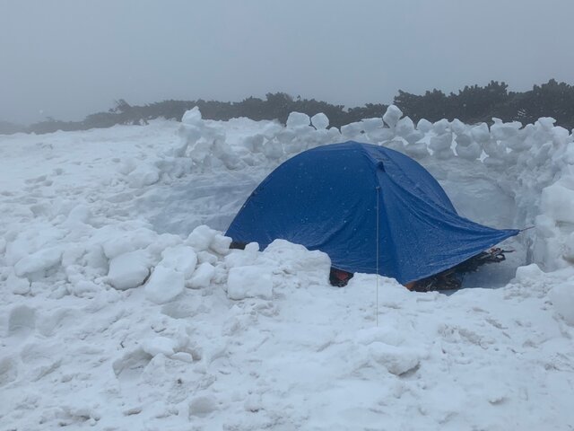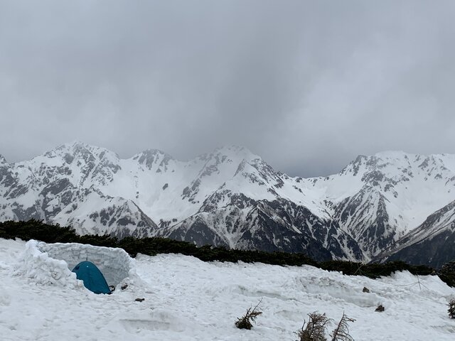 今回の登山は、計画してやっと3度目にして天気も良く実現した。日帰りも可能だが夕焼け、朝焼けの景色を目的にテント泊にした。それと3年前に蝶ヶ岳・常念岳に縦走した時、蝶ヶ岳山頂により写真を撮っていないのでリベンジ登山でもある。次第に天気が曇ってきて山頂からの景色が楽しめるか心配になってきた。あえぎながら登りどうにかテント場に着く。見る見るうちに槍、奥穂高、常念岳がガスに覆われていく。風も強くなり急いでテントを設営し中に逃げ込む。雪が舞い始めた。早速お湯割り焼酎で乾杯。山談義に花が咲く。夕食は定番のハンバーグカレーとスープ。20時就寝、外は雪と強風である。4時起床、強風だが雪は降ってないようだ。まずは、コーヒーで体を温める。さすがに厳冬期ではないので夜寒くて眠れないことはなかった。ただ風の音で熟睡はできなかったようだ。