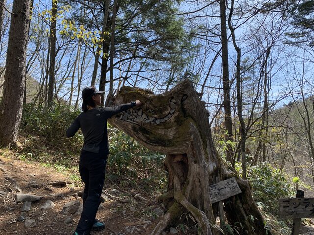 40分でゴジラににた木に着く。まめうち平の先から雪が有り12本アイゼンを装着する。